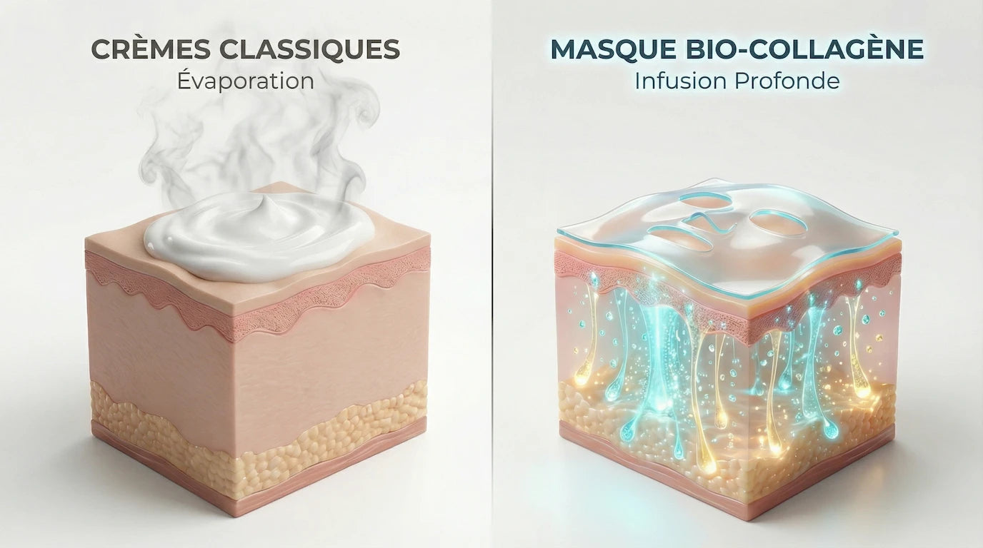 Les études dermatologiques montrent que jusqu'à 90% des actifs des soins traditionnels s'évaporent dans l'air ou sont bus par le coton de votre taie d'oreiller.