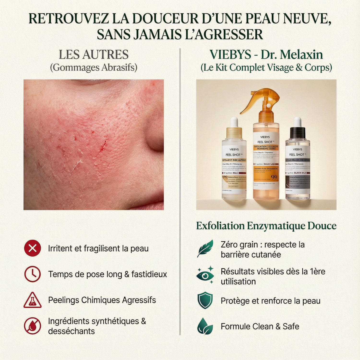 - 100 % douceur, 0 % dommages. Les peelings classiques vous assèchent la peau ? Notre formule hydrate tout en purifiant. Vous payez pour des résultats, pas pour des rougeurs.